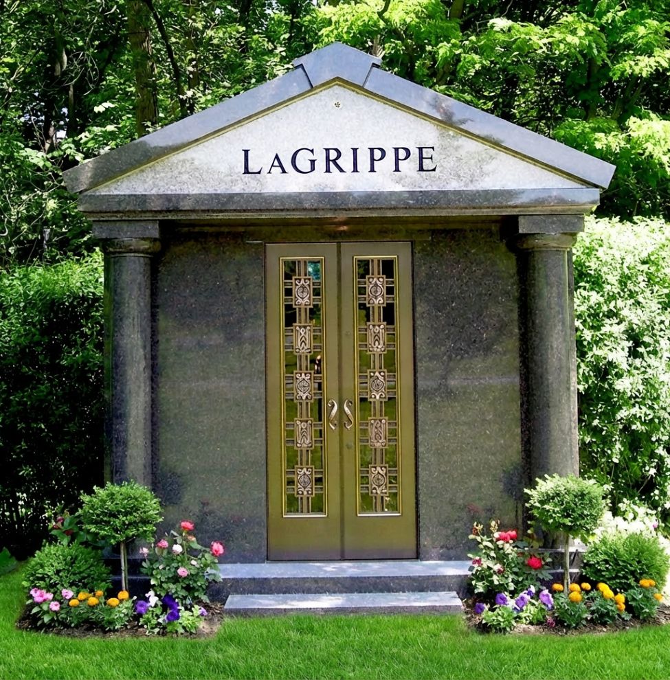 The LaGrippe mausoleum features custom bronze doors and was installed at Bronswood Cemetery.