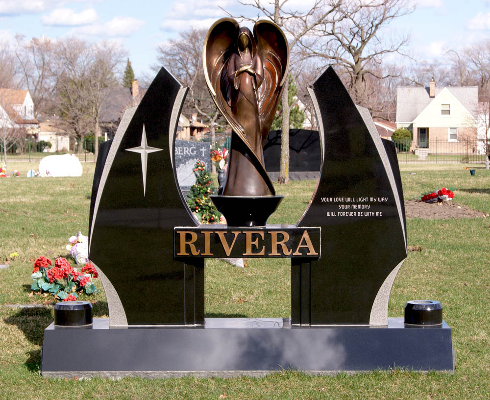 Black granite monument with contemporary bronze angel statue and bronze letters