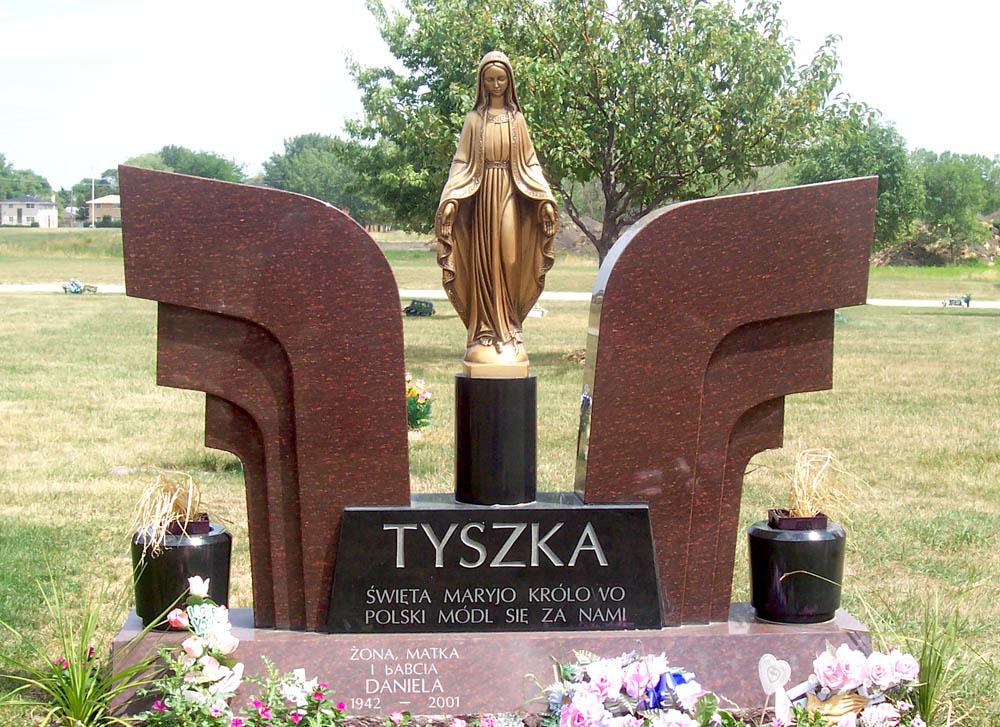 Contemporary wing monument with bronze statue of Mary