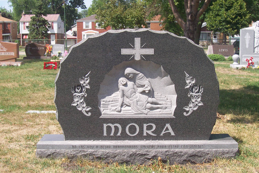 Dark grey granite with bas relief of Mary with Jesus, Spanish verse