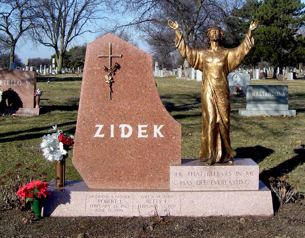 Rose color granite monument with full round bronze statue of Jesus and bronze cross with rose